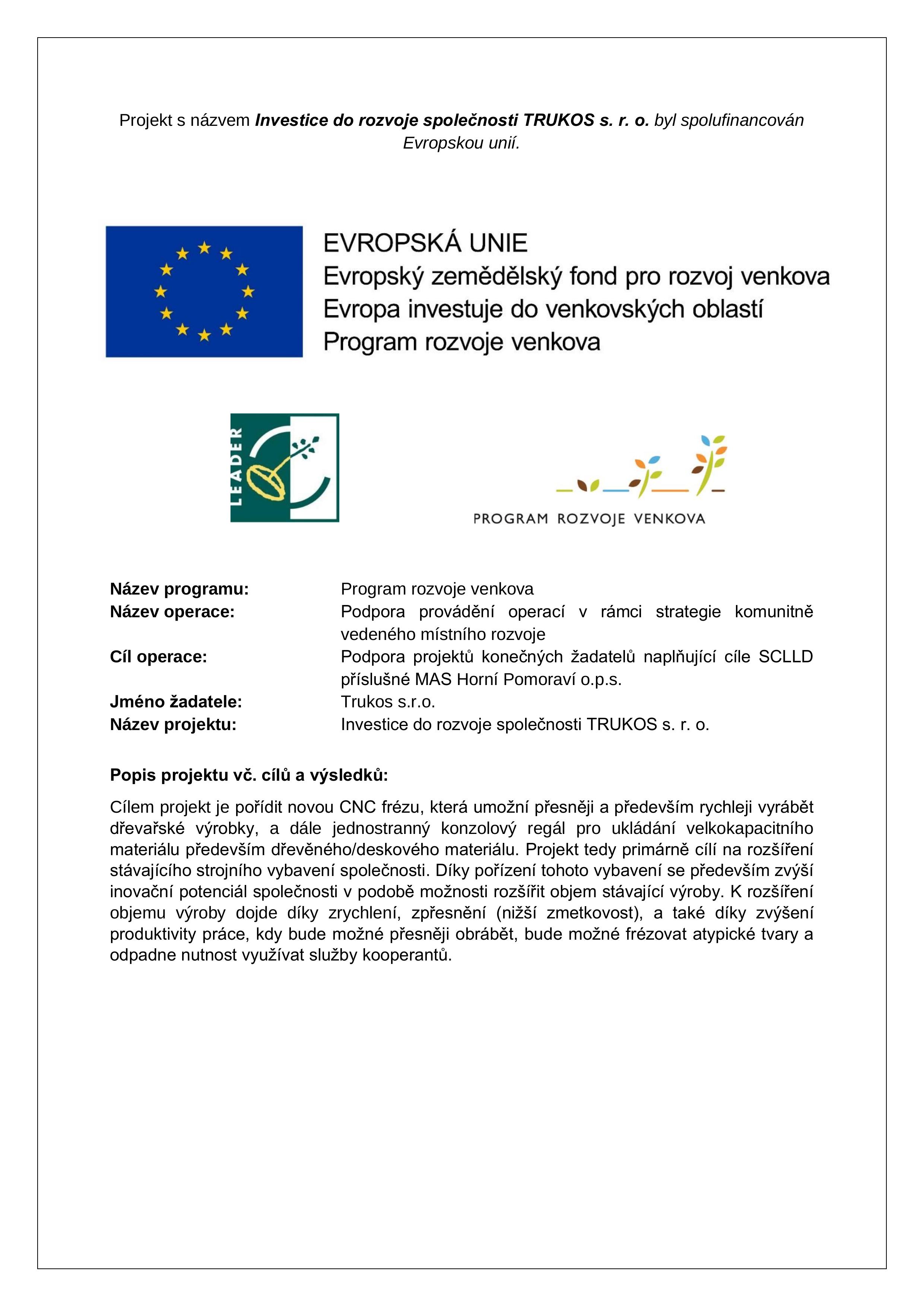 Cílem projektu Investice do společnosti TRUKOS s. r. o. je pořídit novou CNC frézu, která umožní přesněji a především rychleji vyrábět dřevařské výrobky, a dále jednostranný konzolový regál pro ukládání velkokapacitního materiálu především dřevěného/deskového materiálu. Projekt tedy primárně cílí na rozšíření stávajícího strojního vybavení společnosti. Díky pořízení tohoto vybavení se především zvýší inovační potenciál společnosti v podobě možnosti rozšířit objem stávající výroby. K rozšíření objemu výroby dojde díky zrychlení, zpřesnění (nižší zmetkovost), a také díky zvýšení produktivity práce, kdy bude možné přesněji obrábět, bude možné frézovat atypické tvary a odpadne nutnost využívat služby kooperantů.