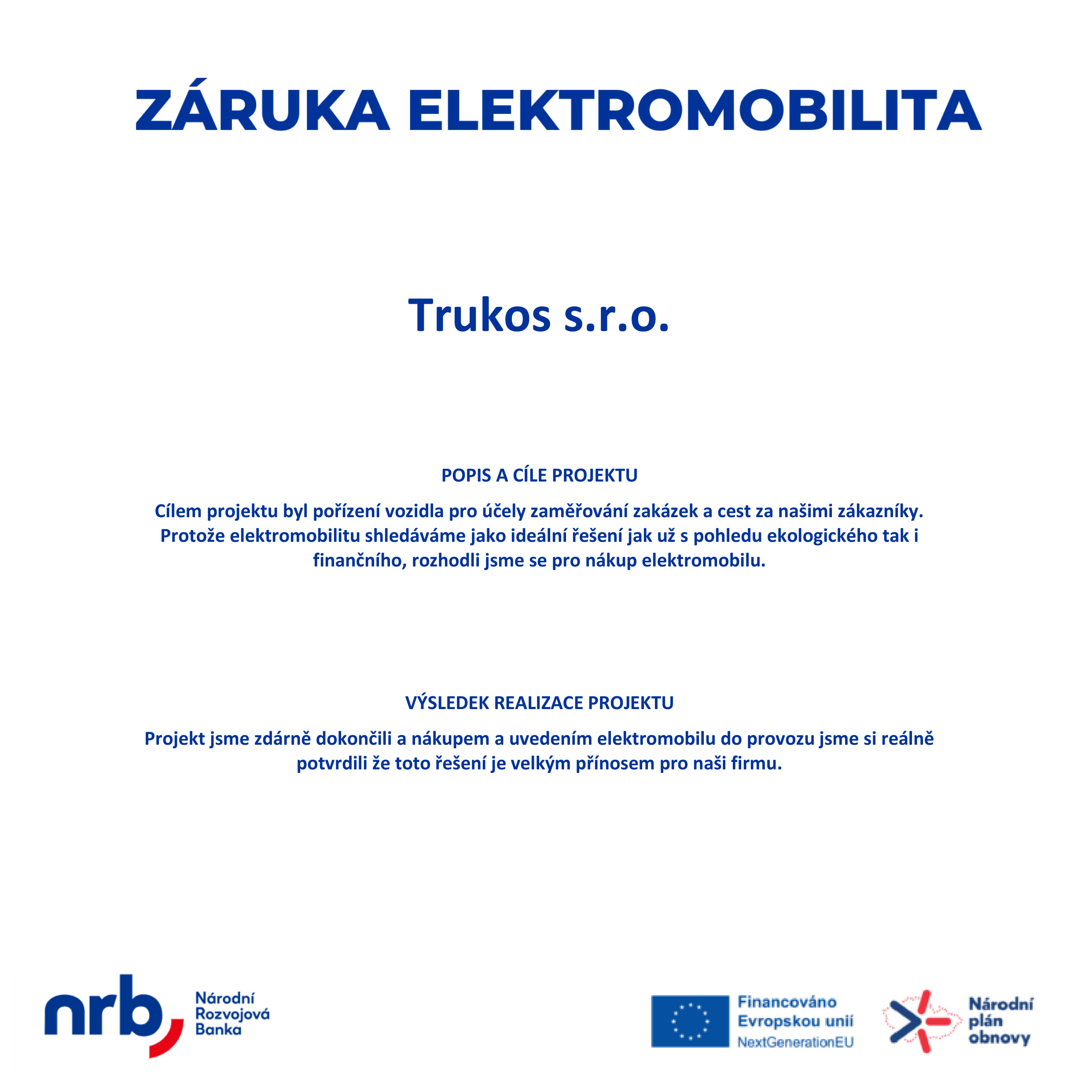 - Nákup elektromobilu byl úspěšně dokončen a jeho nasazení do provozu plně potvrdilo očekávané přínosy pro naši společnost.